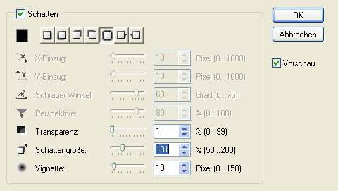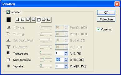 wählen. Rechte Maustaste Schatten mit folgenden Einstellungen: Als nächstes den Menüpunkt: Effekt - Füllungen und Texturen -